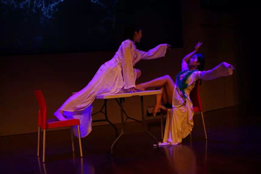 由南洋人带来的扯铃,出场即为惊艳。表演的人被隐在背景里,黑色的舞台上,发光的扯铃如同舞动的精灵,杂耍般的特技展示让人惊喜连连。