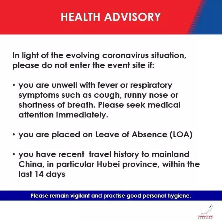 (航展官网贴出公告,通知出现症状的、正在接受隔离及过去14天去中国大陆的民众不要前往航展)