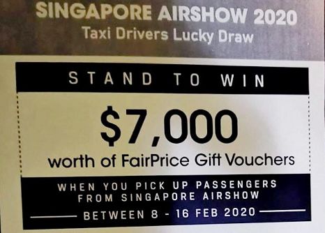 为吸引人气,主办方安排超过7000新币的抽奖活动,表示只要德士司机在航展举办期间,去樟宜国际会展中心接客人,就可以领取抽奖券,还有机会获得职总平价超市(Fair price)100新币礼券。如果在航展高峰期即2月11日至16日下午3点30分至6点30分到上述地点接客,还可另外多领取一张抽奖券。