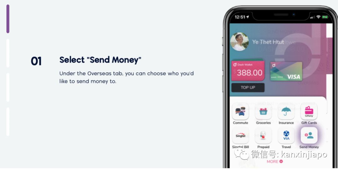 跨境汇款第一步,下载Dash手机应用后,10秒注册Singtel Dash手机钱包,点击Send Money(转账),选择Overseas(海外),首次汇款前需按照提示提交个人材料供审核。