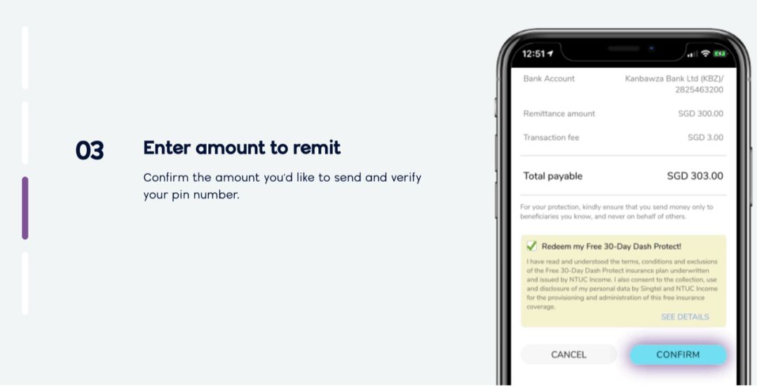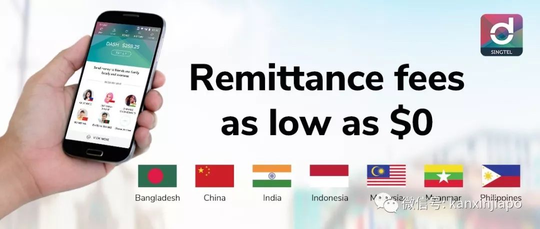(接触完钱币一定要立刻洗手,千万不可放嘴里)其实现在在新加坡,根本不用出门,也不用碰纸币,在家下载一个Singtel Dash手机钱包就可以进行跨境汇款!Singtel Dash是Singtel(新电信)集团推出的获新加坡政府批准的汇款服务,也是目前少数提供手机汇款服务的平台。只要在手机上点几下,就能把钱从新加坡汇往中国、印度尼西亚、菲律宾、缅甸、印度、马来西亚、孟加拉等地。而且,最关键的是,汇款服务费低至0新币!