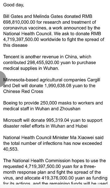 然后邮件中又说了某某公司捐赠了多少钱,某某公司捐赠了多少医疗设备。反正列举的都是腾讯、波音、戴尔这样的大型知名公司,真是难为骗子了,把知道的公司名字全写进去了。 最后邮件描述了一下疫情的严重性,劝说收件人捐款,并且还留下了捐款账号。 可是网友再度质疑,首先对方再次来信的邮箱地址也非常奇怪,而且留下的捐款账号也为私人账户,如果是政府行为为什么要留下私人账户进行募捐?看来,这一切只有用骗局来解释才最为恰当。