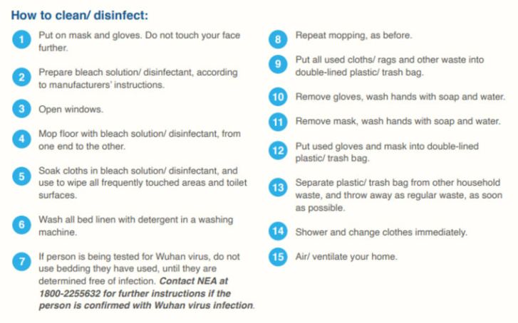 为维持环境卫生,阻隔病毒传播,新加坡国家环境局发布指南,教导民众如何对可能暴露在病毒下的区域,进行清洁消毒。国家环境局建议屋主以及建筑物的所有者或管理者,如果在确认有人在该区域感染病毒后,更要及时采取相应消毒措施。