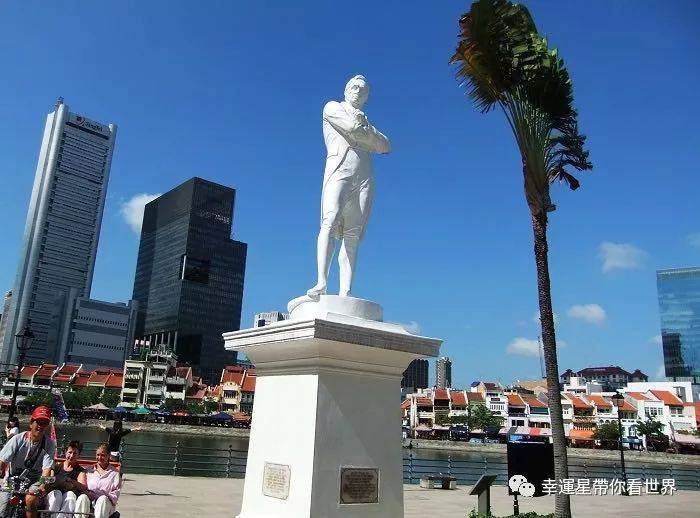 新加坡国父淡马锡·莱佛士爵士在新加坡河边巨大乳白色雕像,这里是他登陆的地点。Singapore's founding father, Sir Thomas raffles, lands in a giant ivory statue on the Banks of the Singapore river.