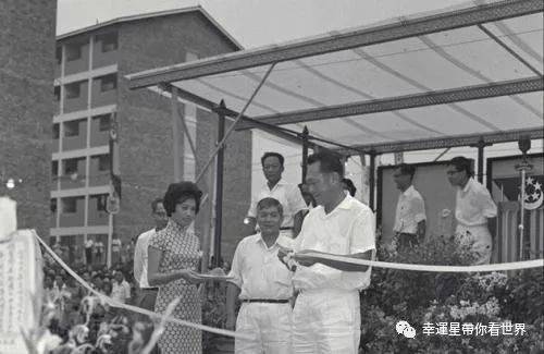 这种黑白老照片是李光耀先生参与新加坡一处公共屋村(Public housing estates)的建成剪彩仪式。