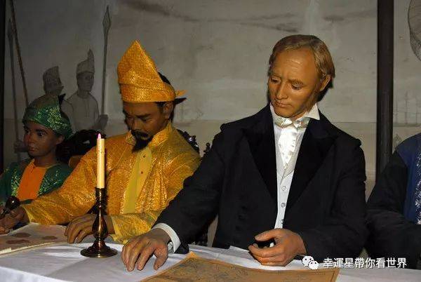 新加坡国立博物馆(National museum of Singapore)淡马锡·莱佛士爵士的蜡像作品。反应的是淡马锡·莱佛士爵士与当地土著首领:天猛公,签订《友好同盟条约》(Treaty of friendship and alliance between Thomas Raffles and templeton)。