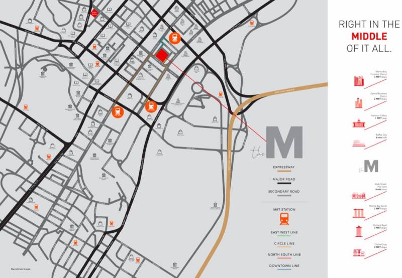 The M 位于新加坡繁华的市中心,交通十分便捷,被四个地铁站环绕,可以方便搭乘地铁绿线、蓝线、黄线、紫线,到达岛上任意地方。