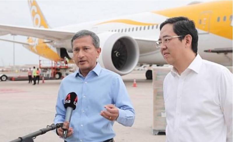 新加坡外交部长维文医生8日下午在樟宜机场停机坪上,向中国驻新加坡大使洪小勇转交了这些物资。