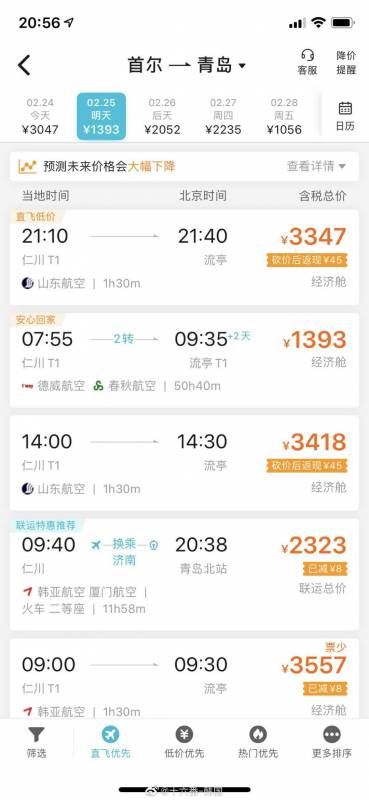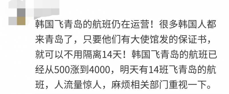 韩国飞青岛、北京、上海的航班,被炒到了4000元—7000元不等的高价,即便这样也是一票难求的状况……网友不仅调侃:看来韩国已经认识到,中国比韩国安全~