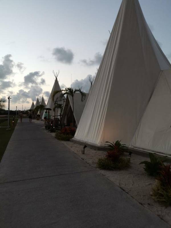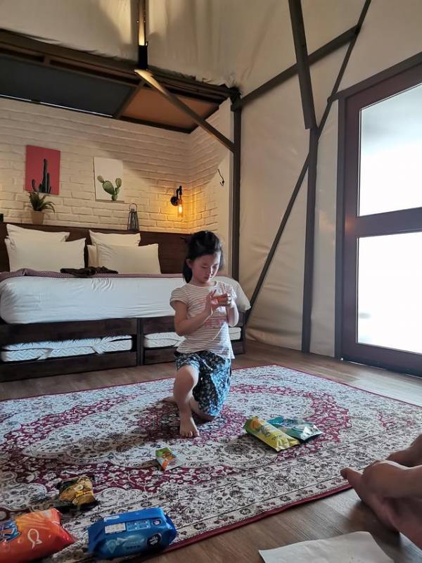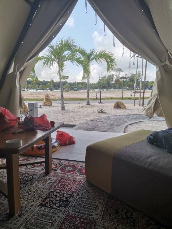 民丹岛酒店有很多类型,有整栋临海别墅,有海边度假村,还有独具风情的帐篷酒店,旅游区外还有各种民宿。由于带着孩子,所以订了岛上旅游区的帐篷酒店,酒店旁边有一个人工湖,干净漂亮。