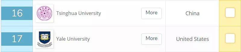 国内北京大学和清华大学这次在榜单上也取得了相当好的成绩,清华大学排名16, 比去年上升一位。紧接着排在清华后面的是美国知名院校、曾经培养众多美国总统的耶鲁大学。