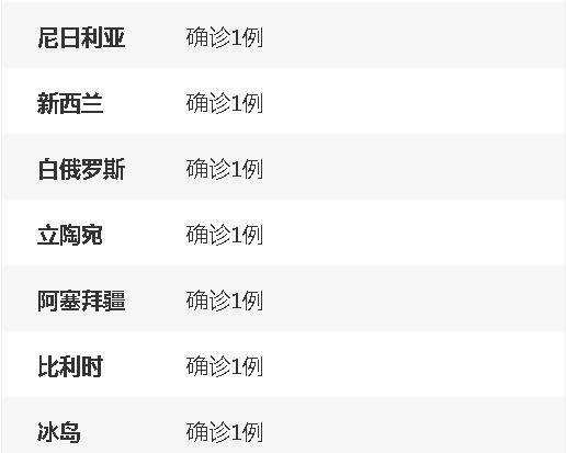 冰岛:当地时间28日,据当地媒体报道,从意大利北部度假返回的50岁冰岛男子被确诊新冠肺炎。这是冰岛首例新冠肺炎患者。
