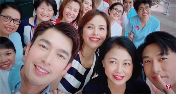 艺人黄俊雄(右2起)、向云、郑惠玉和陈泂江(左)走访陈笃生医院、竹脚妇幼医院和樟宜综合医院。(互联网)