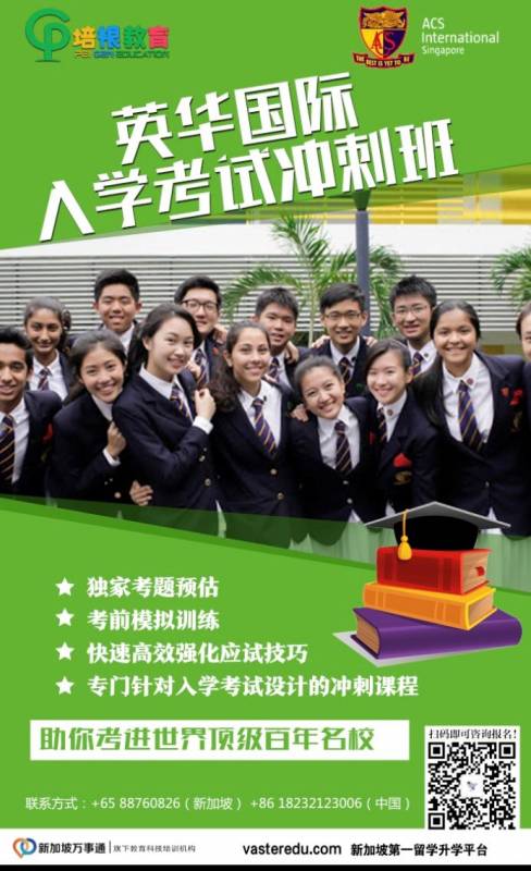 新加坡本地一所百年名校英华国际学校是一间国际性质的学校,于1886年成立,是新加坡几百名学校中名列第三的重点中学.作为一所有着超过百年历史的老牌名校,现在的英华国际总共有6所学校:ACS Junior ,ACS Primary (小学),ACS Barker Road(小学和初中,校内有ACS Oldham Hall),ACJC(Anglo-Chinese Junior College相当于国内的高中),ACS International(初中和高中),ACS Independent(初中和高中,包括ACS(I) Boarding School)。