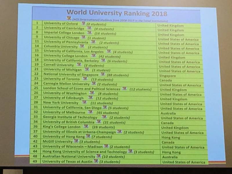 满分45分的IB考试,能达到36分-38分的学生,就有资格申请英国剑桥等一众国际名校。遥遥领先的IB成绩,直接撬开了学生的名校大门。2018年,英华中学国际申请世界Top前10的顶尖名校有23人,申请世界Top前50名校的总共有367人。