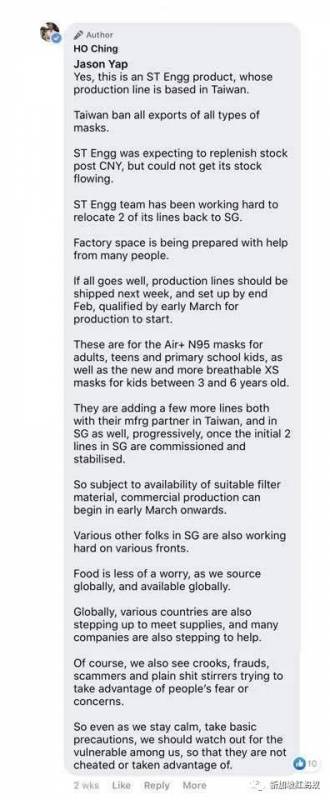 新加坡总理夫人何晶早在2月7日,就在面簿上抢先公布了这件事。当时有网民在她的帖文下留言说: “这是ST Engg设计的口罩,我们可以让他们生产这款口罩作为备用吗?”
