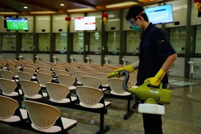 每日中午休息和下午下班后均安排保洁人员对大厅柜台、桌椅、地面、电脑键盘、复印设备、楼梯扶手、卫生间等公共场所和设施进行彻底清洁消毒,同时在大厅配备两台大功率空气消毒机,尽力让每位来访人员来得安心,设施设备用得放心。
