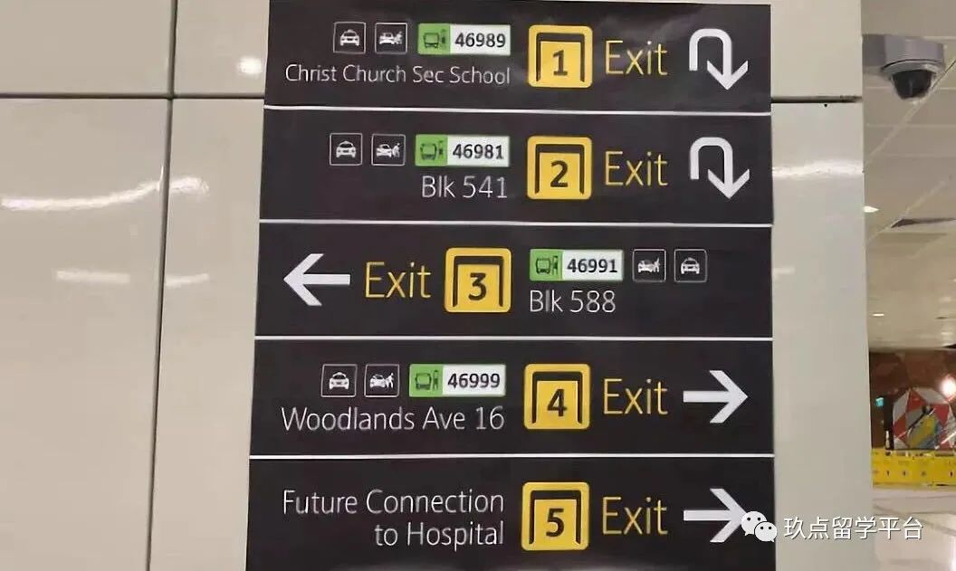 出口指示牌采用醒目的黄色和黑色搭配,且以罗马数字取代英文字母,乘客能在远处看见自己要前往的出口;指示牌也会把附近地标都罗列在一起,并注明应该前往几号出口,方便乘客前往目的地。