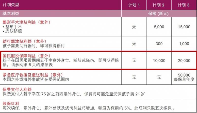 针对新加坡,AIA还推出新加坡特色的“兵役保障”,很多留学生(男生)会在读书时收到PR邀请信,最近几年,服兵役意外事件也层出不穷,着实让男孩子的父母担心。