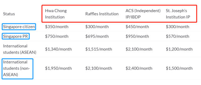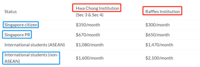 以上为新加坡公立中学的费用,而对于新加坡私立中学而言,每一所学校因其不同的课程设置等有着不同的学费标准。以新加坡华侨中学(Hwa Chong Institution)和莱佛士书院(Raffles Institution)为例,相较于公立中学,学费则有所上升: