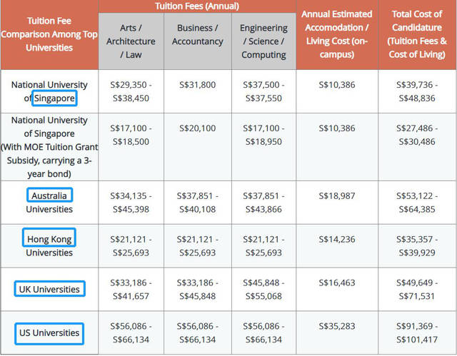 新加坡政府会给予一定的学费补助,以新加坡国立大学为例,补助后的学费具体为:新加坡PR11,500新币每年、国际学生17,500新币每年。相较于欧美其他国家,新加坡的学费有着非常大的优势: