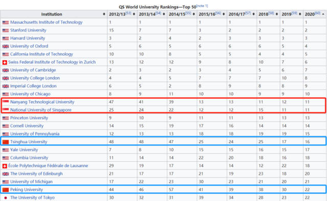 2020年QS世界大学排名中,新加坡国立大学和南洋理工大学并列排名全球第11位,遥遥领先于亚洲其他高校。其中,麻省理工学院继续蝉联第一,史丹福、哈佛、牛津、剑桥等名校紧随其后。而中国的清华、北大在此次排名中也取得不俗的成绩,分别位列第16位、第22位。