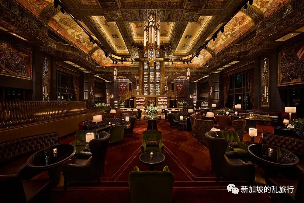 14米高的金碧辉煌,像走入 《大亨小传》的场景里。装饰主义风格,金铜色的主色调,酒红色的地毯,配上皮质沙发、绒布窗帘,都在高喊纽约1930年的低调奢华风情。
