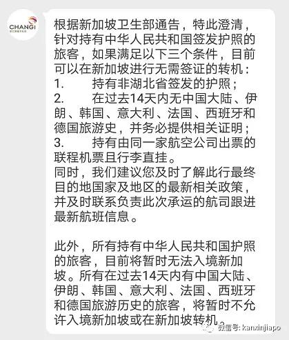 随后新加坡眼向樟宜机场求证,该消息并不正确。根据新加坡卫生部规定,满足以下三个条件的中国护照持有者,可以无签证转机: