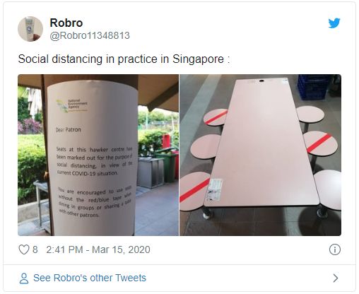 与此同时,全岛多处也开始采取减少社交接触措施,包括小贩中心。由新加坡网友在Twitter上分享了小贩中心的照片,以及新加坡国家环境局的告示。照片中可见已将部分座位贴上了红色的贴纸,呼吁公众避开这些座位,旨在希望公众隔开来座,减少社交接触。