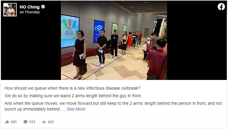 此前新加坡政府跨部门抗炎工作小组宣布了一系列减少社交接触(social distancing)的举措,包括建议出席者任何活动者保持至少一米距离。对此,李显龙总理夫人何晶也促请新加坡人在公共场所排队时,与他人保持距离,切勿尾随。