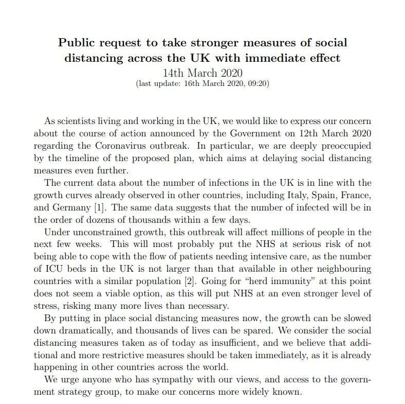 3月14日,四百余名科学家联署发表题为《即刻于全英境内采取更严厉社会疏离措施的公开呼吁》的公开信,质疑英国政府的做法,称当局未能采取足够严厉的措施来遏制疫情,呼吁在社会疏离方面采取更强有力的行动,以阻止人们相互接触。