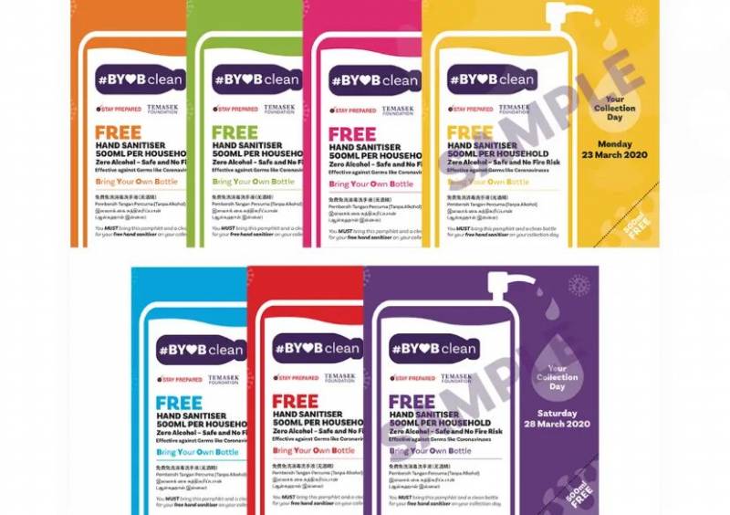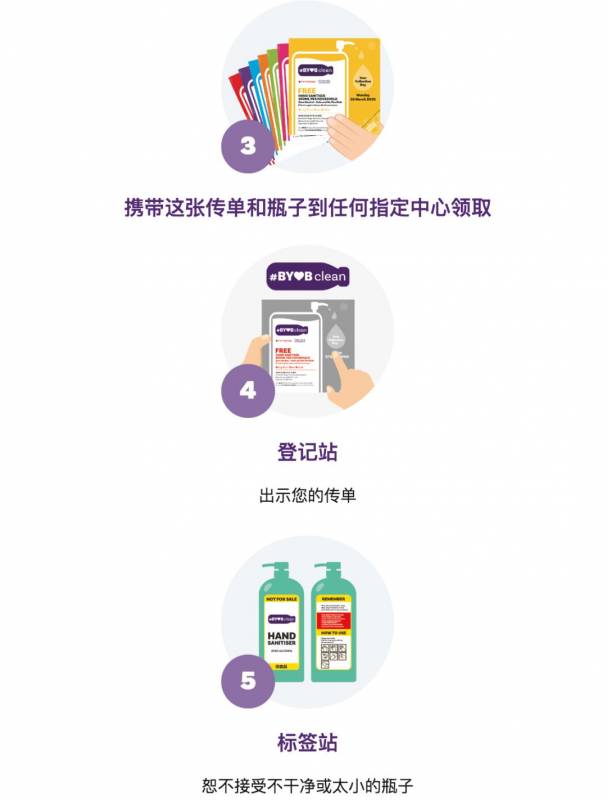 (这项名为#BYOBclean的消毒洗手液赠送活动,由淡马锡基金会发起)这款洗手液含有0.054%苯扎氯铵溶液,能有效抑制冠状病毒等病菌。它无毒、不易燃、无腐蚀性,亦不会刺激皮肤或污渍的洗手液,并且也能生物降解。当没有肥皂和水的时候,我们可以使用免冲水的消毒洗手液来清洁双手,避免把细菌和病菌传播给他人和自己。2020年3月20日之前,新加坡的每户家庭会在信箱里收到一份免费领取的传单,如果没有传单或有其他需要帮助的请拨打 1800 738 2000(3月16日至4月5日)。