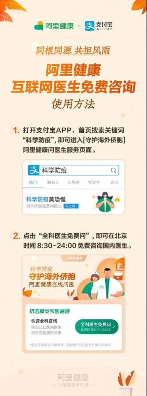 “海外侨胞在线医疗咨询专区”通过支付宝平台提供服务,医师团队由有湖北问诊经验且经过新冠肺炎诊疗方案培训的公立医院执业医生组成,免费问诊时间为北京时间8:30-24:00。