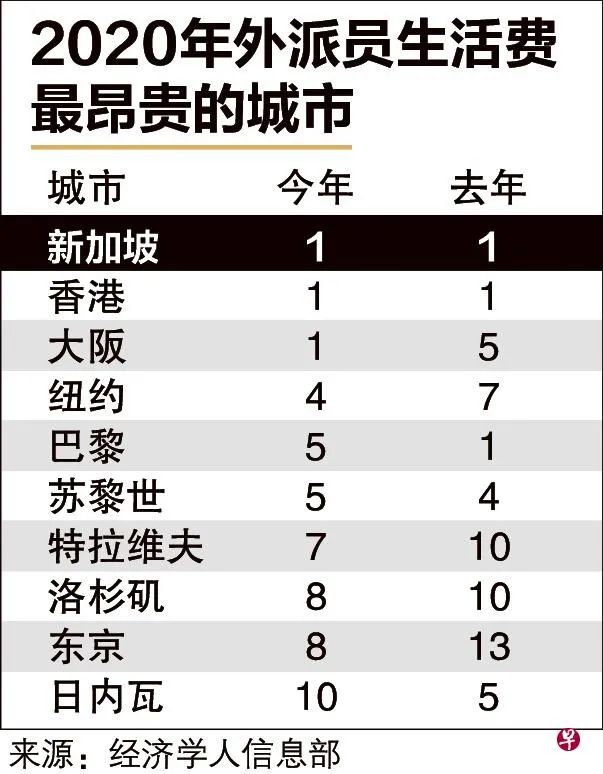 新加坡连续六年成为外派人员生活费最昂贵的城市。根据经济学人信息部(The Economist Intelligence Unit)最新出炉的报告,新加坡、香港和大阪并列外派人员生活费最昂贵的城市,当中,大阪是从去年的第五位升到第一位,取代了去年跟新加坡和香港并列首位的巴黎。巴黎今年花落到第五位。这也是该调查首次出现三个亚洲城市同列榜首的情况,加上排在第八位的东京,全球首10名当中共有四个亚洲城市,较去年少一个。报告指出,许多城市在指数值与名次上的变更,主要是因为汇率的变动所致。例如欧元兑美元在2019年走软,便推动了美国众多城市排位往上移,而欧洲城市则下滑。大阪和东京的排位都是因为日元升值而上升。东京今年晋升五个名次,与洛杉矶齐名,并列第八。巴黎滑落,与微跌一个名次的苏黎世,并列第五。纽约和洛杉矶是因为美元上扬、服装及帮佣成本上涨,分别升上第四和第八的位置。前10名唯一的中东城市特拉维夫,因汽车价格等交通成本上涨而升上第七。去年排名第七的哥本哈根今年落榜。在10大最贵城市中,唯有新加坡和香港的排名不变。报告指出,央行的宽松货币政策、围绕中美贸易战的不确定因素、欧洲经济及能源价格疲弱等因素,导致受调查的城市生活费平均下跌了4%。另一方面,生活费最低的城市排名变动不大,南亚城市仍占多数,包括巴基斯坦的卡拉奇(Karachi,第129位),印度的真奈(Chennai,第126位)、班加罗尔(Bangalore,第125位)等,因为整体薪资低等结构性元素,生活费处于低水平,但近年来排名已逐渐上升。调查中生活费最低的三个城市依序为叙利亚的大马士革(Damascus)、乌兹别克斯坦的塔什干(Tashkent)和哈萨克斯坦的阿拉木图(Almaty)。这份报告在全球90个国家的133个城市,比较了160项商品服务的超出400种价格,为企业计算外派人员和出差人员的生活补贴与薪金配套提供参考。