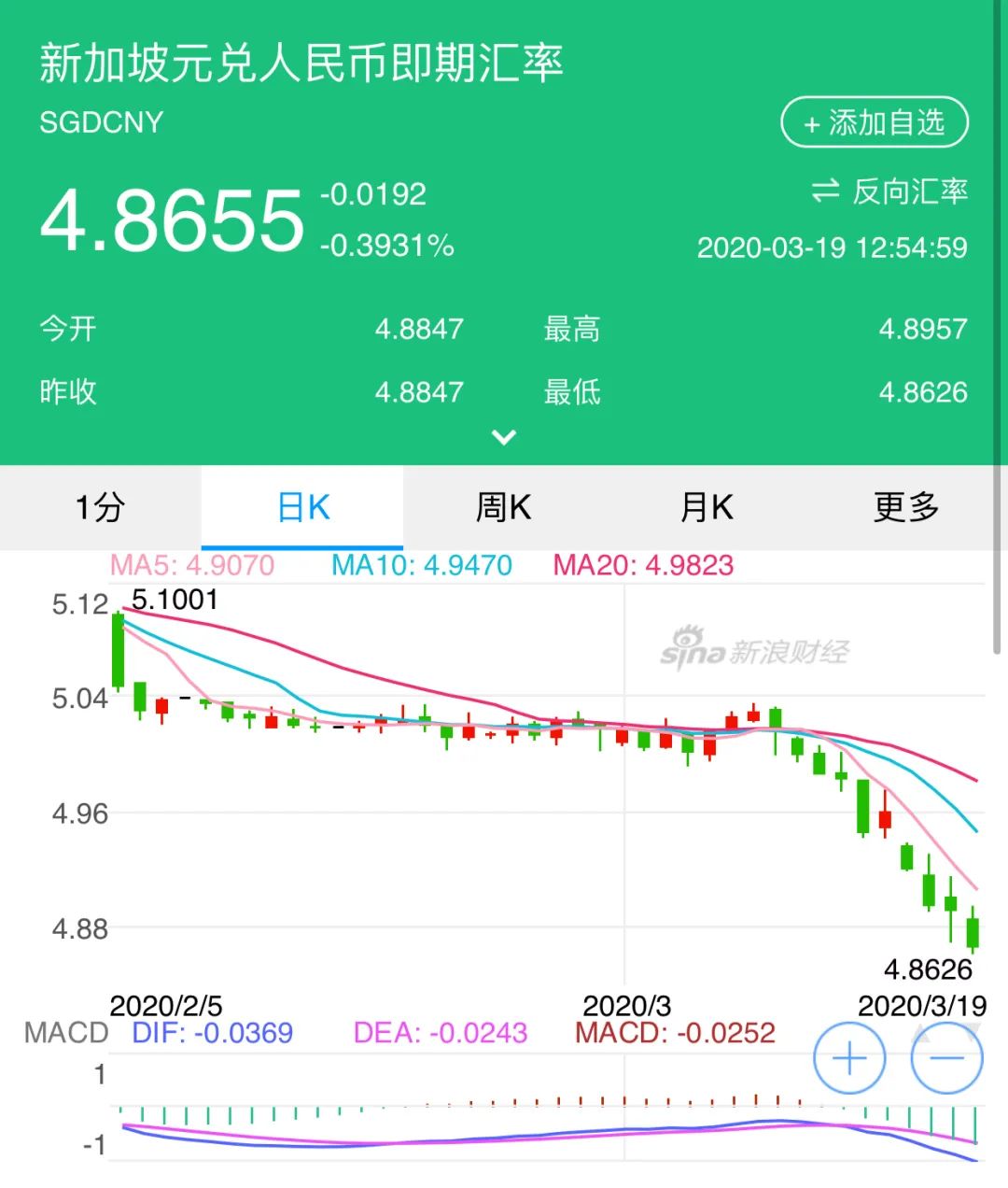 3月14日新币对人民币的汇率才刚跌破5,3月18日汇率又再次下跌到4.86,创2018年7月以来新低。