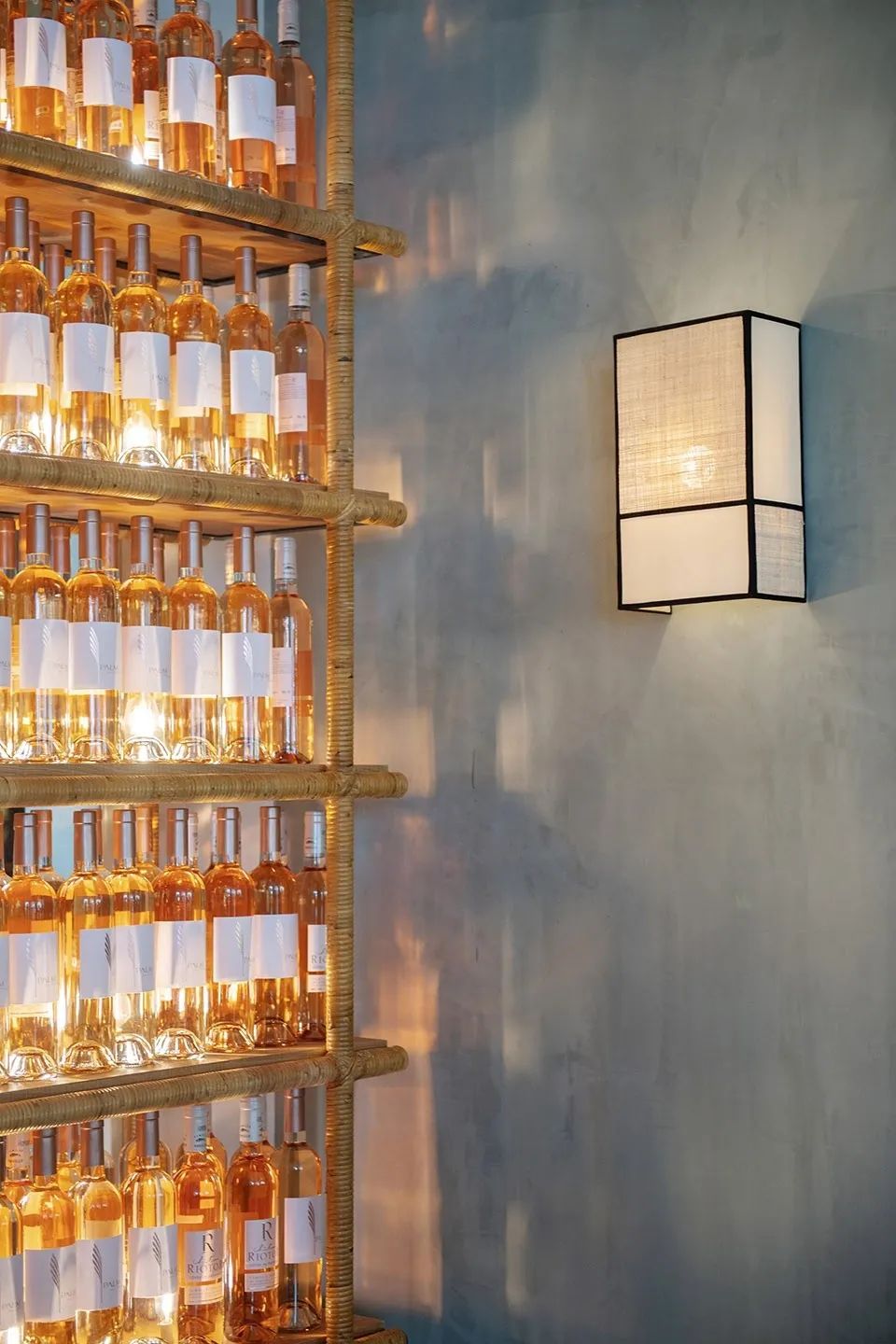 设计团队还在入口窗户的附近设置了一面特殊的墙体,这面墙体被客户亲切地称为“玫瑰墙(Rosé Wall)”。这面由货架构成的墙体被包裹在藤条之下,成为了Merci Marcel餐饮空间的主要特点。应客户的要求,每个架子上都设有低压的焰球灯,以便将柔和的光线投射到展示中的法式玫瑰花瓶上。