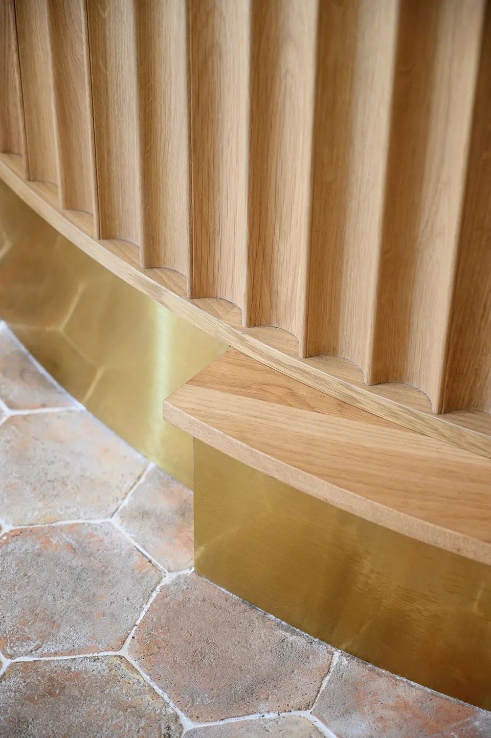 吧台侧面上装饰著带有凹槽的实心白蜡木条