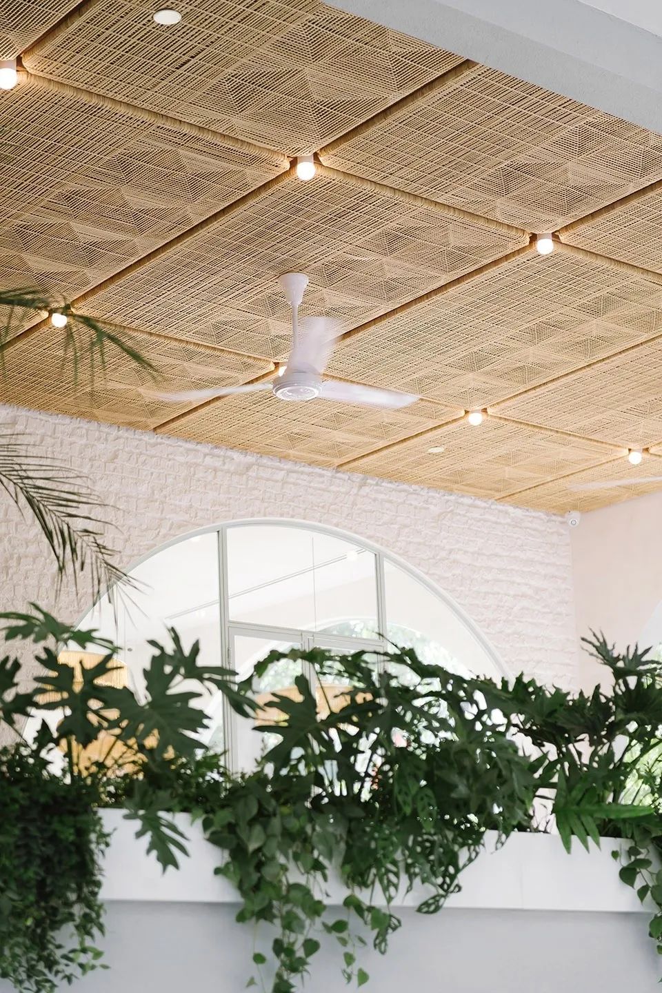 凹室和露台用餐空间的天花板皆采用由BYO Living在印度尼西亚专门制作的、由藤条编织而成的面板。其他空间的天花板则采用穿孔的隔音板。