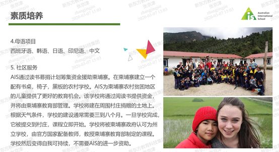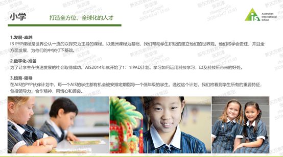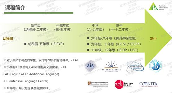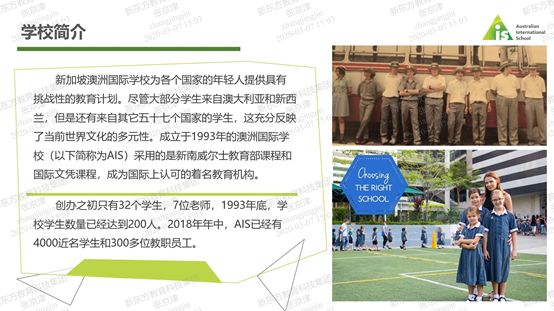新加坡澳洲国际学校致力于成为全球公认的最优质教育机构,教导学生不断超越期望,为世界做出贡献。使我们的学生通过培育和机会,了解并发挥自己的潜能,在生活中蓬勃发展,良好作为。澳洲国际学校的办学理念是全面的教育,学校珍视艺术和体育,以及每个学生的教育主要尺度概念。每个孩子都是特别的,每个都是很重要的。澳洲国际学校(AIS)是新加坡唯一的南半球学校,提供从3至18岁的课程学生学习澳大利亚的课程基础。澳洲国际学校的国际教育从小学文凭计划开始(IBPYP),从学前班到小学五年级,在六年级到初三,以及高中毕业证书,一所学校的具体澳洲的课程框架,剑桥或国际文凭课程为11和12年级。