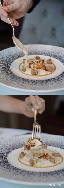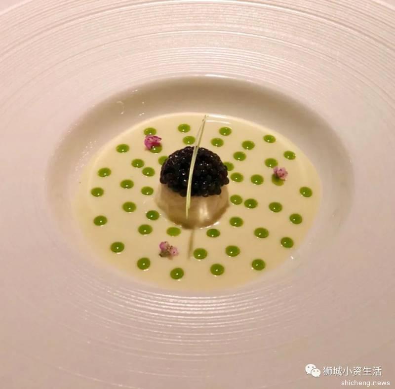 除了搭配鱼子酱,这上面那一个个仿佛经过精细计算的小绿点完美地取悦了强迫症患者。那可不是随便用来装饰的。那是韭葱打成的酱,混合了油,做出的艺术与口感上的点缀。是的你没猜错,这个韭葱也是进口的。