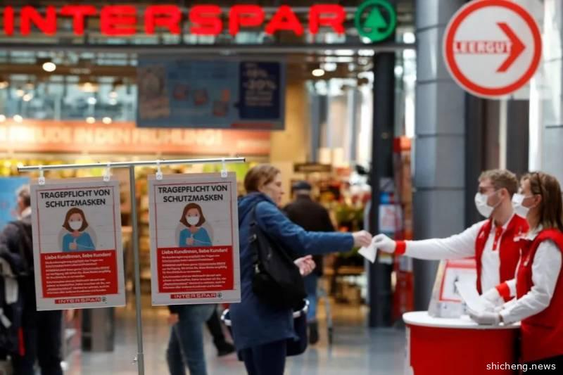 奥地利超市门前有免费派发口罩。(图片来源:路透社)
