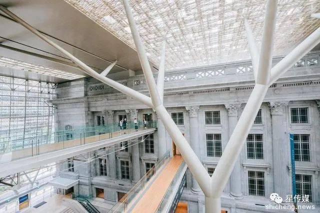 白色穹顶周围是银白色支柱,在整个美术馆都能看到这样的支柱。起码在配色上都保持高度统一了。