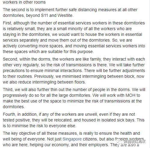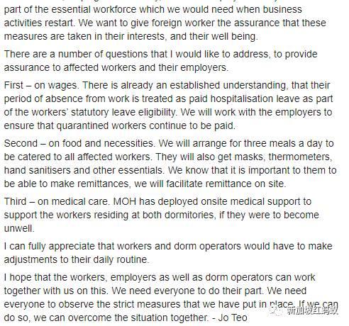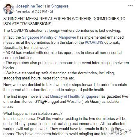 对于能否更早地避免客工宿舍出现感染群,人力部部长杨莉明在接受媒体采访时这样说,客工宿舍其实比社区更早采取严谨的防疫措施。“宿舍是客工的家,他们在宿舍感染病毒的风险,同国人在自家中被传染的概率相去不远。”“我们在客工宿舍实施的预防措施,比社区内所采取的来得多……上星期人力部与客工宿舍合作,确保客工分不同时段用餐和进行休闲活动,以及限制不同宿舍楼住户间的接触等。”她再三保证,在隔离期间,客工的薪资将不受影响,一日三餐也会有着落,由专人送往宿舍。