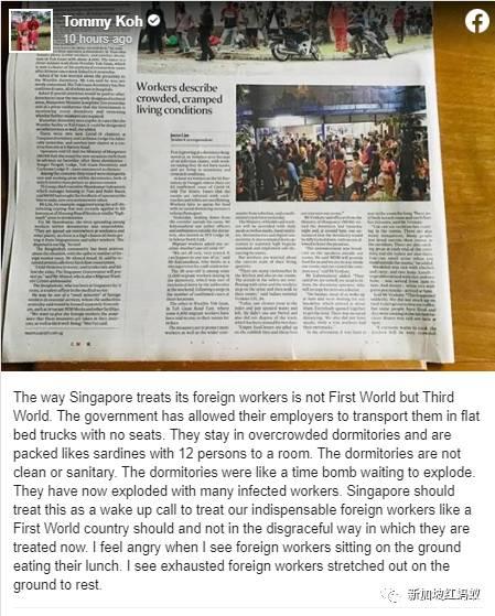 也是加坡国立大学国际法中心主席和香灰莉木学院院长的许通美,今天在面簿上分享《海峡时报》的一则标题为“外籍客工描述被列为隔离区的宿舍的居住条件拥挤和空间小”的报道时写道,新加坡对待外籍客工的方式不是第一世界,而是第三世界。这并不是许教授首次如此点评国人的素质了。他曾在去年10月发表了“新加坡作为第一世界国家,人民素质却处于第三世界水平”看法,引发热烈讨论将近三个月。许教授解释说,政府允许他们的雇主用没有座位的罗厘载送他们。他们住在过于拥挤的宿舍里,12个人挤在一个房间里。“宿舍既不干净又不卫生,宿舍就像一个随时会爆炸的定时炸弹。而如今真的引爆了,许多住在那里的客工遭感染。”他说,这是一个警钟。新加坡应该像第一世界国家那样对待我们不可或缺的外籍客工,而不是像现在以如此可耻的方式对待他们。当我看到外籍客工坐在地上吃午饭时,当我看到精疲力尽的外国工人躺在地上休息时,我感到很生气。许教授如此动怒并不是没道理的。他的面簿贴文引起国人的共鸣,仅七小时就有2400人转发,3600人按下“伤心”符号。客工住宿卫生条件欠佳,房间过于拥挤,已是一个长年累月的问题。