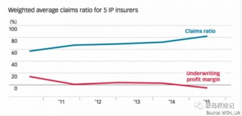 下图11年-15年的5个商业保险从业者医保赔付数据,蓝色线是递增的索赔率,红色线则是保险公司越来越少的利润到负利润。