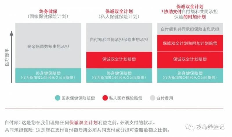 以保诚Prudential的医保演示作为参考,从左到右分别是Medishield,Medishield+IP,和Medishield+IP+IP Rider的账单覆蓋情况。(下图保诚双全计划就是IP,附加计划就是IP Rider)
