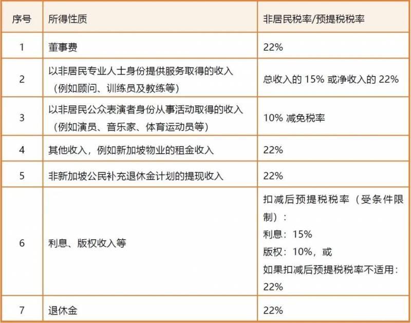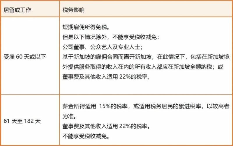 非税务居民如果一年内在新加坡受雇不到60天,其取得的雇佣所得可免缴个人所得税。但该免税规定不适用于公司的董事、演艺人员以及专业人士包括专家、顾问等,董事费及其他收入适用22%的税率,亦无资格享受税收减免。