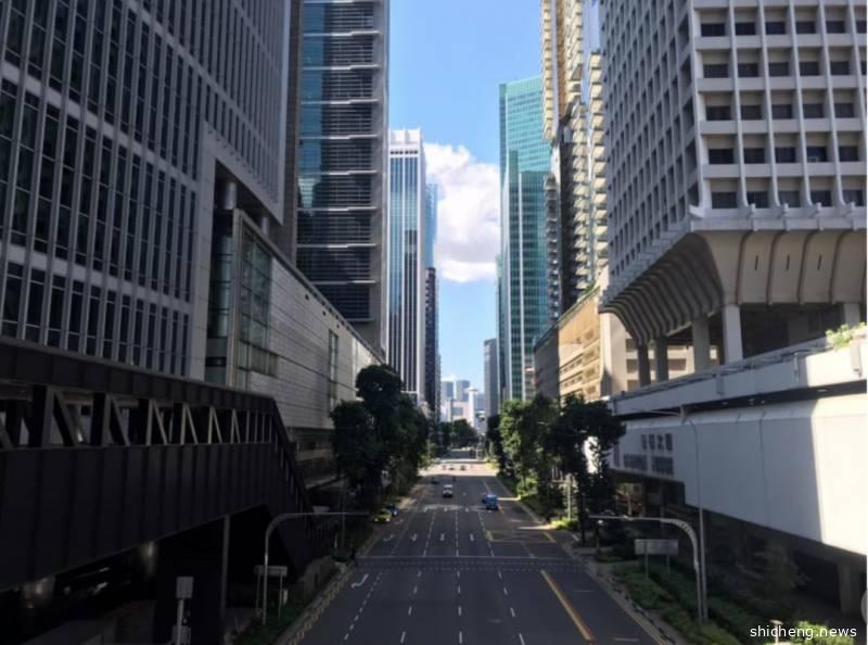 珊顿道(Shenton Way)两旁高楼大厦林立,而这里也是大多数上班族平时工作的地点。然而,在阻断措施期间,非必要服务业的上班族已经被勒令居家办公,因此这里的人潮并没那么多,但还是可以看到几辆轿车和公共巴士川行在道路上。