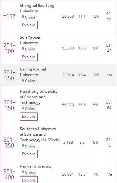 与之对比,排名在201-350的中国大学有中山大学,北京师范大学,华中科技大学,南方科技大学。