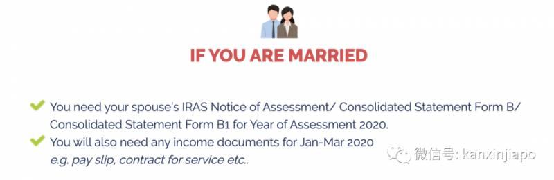 已婚人士需提交伴侣的缴税通知说明、报税表格B或2020年估税年表格B1,以及所有1月至3月期间的收入文件。如果伴侣没有工作,需提交去年公积金户头结单。